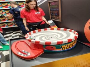 À Essen, vous avez la possibilité de voir les jeux qui buzzent, les jeux introuvables dans le monde, les petites pépites et souvent aussi les jeux WTF. Whirly Derby fait parti de ceux-là. Rien que pour le fun je serais bien reparti avec un exemplaire mais mon enthousiasme ne fut pas partagé. Le principe est extrêmement simple. Vous misez un certain nombre de billes de votre couleur, que vous allez ajouter aux autres. Vous avez une poignée de billes de différentes couleurs (certaines plus rares que d’autres), vous les lâchez dans une sorte d’entonnoir plat, dans lequel elles tournent avant de tomber dans un trou. On regarde ensuite quelle bille est arrivée en première dans la gouttière en-dessous. En fonction, vous allez gagner des trophées (sous forme de cartes). Le plus de points gagne.C’est typiquement le jeu gadget, mais c’est fun.