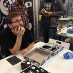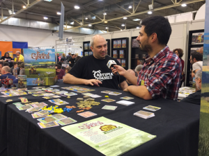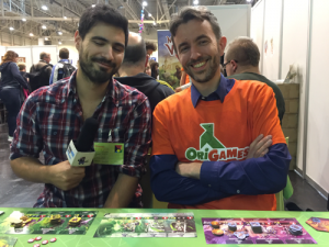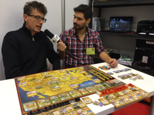 Petit détour par le stand Iello pour une interview avec un grand monsieur. David Parlett, l’auteur du Lièvre et de la Tortue, le tout premier Spiel (1979 !), réédité cette année avec le Tour du Monde en 80 jours chez Purple Brain (dont parle Wraith plus tôt). Non content d’avoir vraiment apprécié le jeu, j’ai beaucoup aimé converser avec un auteur qui a vécu les balbutiements du jeu de société moderne. Un temps calme et émouvant pour la journée un peu folle de l’équipe !