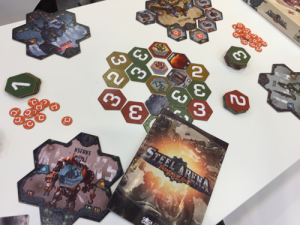 Dans le hall 7, nous nous sommes arrêtés sur Kepler 3042 (ce sont les papas de Bretagne il me semble). Un jeu d’exploration spatiale qui nous avait paru un peu austère au premier abord mais qui nous a révélé une petite perle après l’explication des règles. Nous sommes impatients de nous y coller.