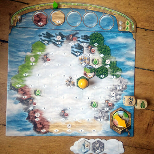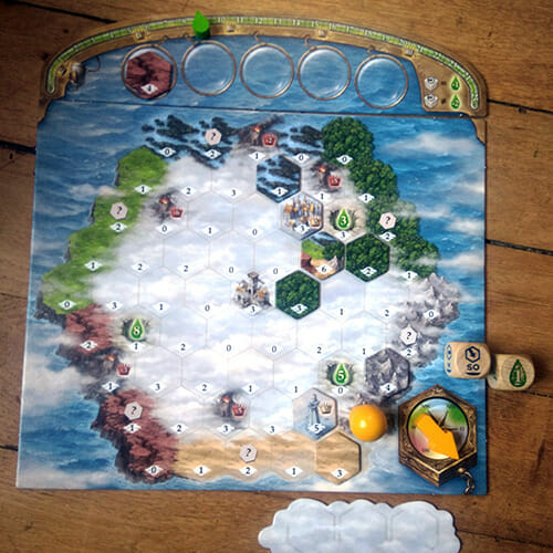 Nous voilà avec chacun son plateau fait de cases et de côtes constituant 6 paysages différents et chacun sa montgolfière. Le même vent nous pousse dans une direction, déterminée par le dé (qui pourra être relancé par le dernier joueur). L’avancée de notre montgolfière dépend du chiffre de la case sur laquelle elle se trouve. En dépensant de l’énergie, on va pouvoir modifier le déplacement mais aussi la direction de notre aéronef. Cela a son importance, puisqu’après le déplacement nous allons pouvoir placer des tuiles paysages sur notre plateau, autour de notre montgolfière. Il s’agit de faire des chemins du même paysage pour marquer des points (2 points par tuile forêt reliée à la côte forêt par exemple).