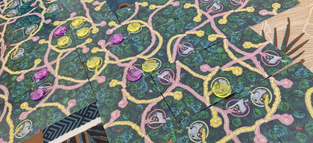 Les illustrations de Nicolas Demers sont d’ailleurs un autre point faible du jeu. Au fur et à mesure que l’on place des tuiles, le jeu devient de plus en plus illisible. Il est fréquent de s’apercevoir après coup que l’on a fermé un chemin alors qu’il restait un embranchement libre, voire même que l’on ferme un chemin sans s’en apercevoir. Les yeux se piquent à observer ce réseau neuronal flashy de jaune et rose fluo (ce qui me fait penser qu’un thème sur la construction neuronal aurait été plus parlant).