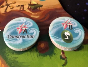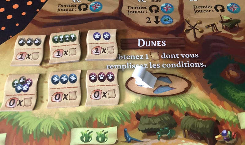 Autre point critiquable d’Everdell qui a été, il me semble corrigé, avec une extension : les cartes objectifs assez peu lisibles qui nous demandaient d’avoir telle ou telle condition et d’y placer un de nos ouvriers pour toute la partie. Cela a été remplacé par des tuiles Cartes que l’on peut aller chercher sur l’emplacement des dunes. Pour cela il faut avoir la condition et dans ce cas on récupère celle du dessus. Il y en a autant que de joueurs mais c’est de moins en moins rémunérateur. En fin de partie on comptera le nombre de cartes que l’on multipliera par la valeur totale sur les cartes (de 0 à 2). Laisser toutes les tuiles au même joueur, c’est ouvrir la porte à une bonne fessée. Il faut donc surveiller un minimum ses adversaires.