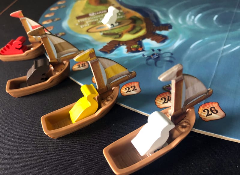 On aura toujours à la fin un tableau de 15 cartes, on retrouve les 5 mêmes familles de cartes, celles qui donnent des points en fin de partie, celles que l’on active avec nos ouvriers, celles qui donnent un revenu, etc. Et on retrouve les mêmes ressources même si elles n’ont plus les mêmes noms, univers maritime oblige, on passe au bois flotté, aux pierres marines, aux algues et aux champignons. La structure d’un tour reste elle aussi la même, placer un de ses meeples ouvriers, jouer une carte ou passer à la saison suivante.