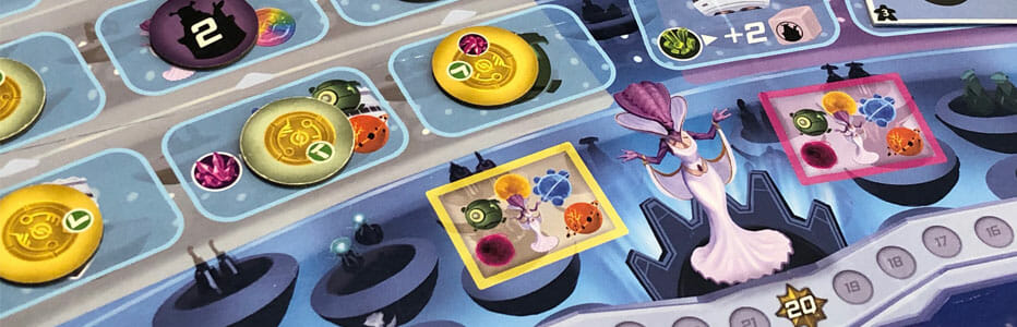 Enfin, la planète robotique nous permet de dépenser nos ressources sur les petites structures afin d’y gagner des bonus (comme par exemple un vaisseau) qui seront aussi des revenus en fin de manche, ou bien sur les méga-structures (contre une ressource rose, verte et surtout d’un diamant d’or) pour immédiatement remporter des points en fonction de notre avancée sur différents critères (par exemple, selon son avancée sur telle et telle planète). Petit effet course, puisque le premier arrivé aura un multiplicateur plus puissant que le deuxième. Joué au bon moment c’est un moyen de marquer entre 12 et 18 points ! Voilà un des endroits où l’on se surveille de près.