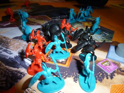 Dès qu’un joueur déplace une ou plusieurs unités dans une zone déjà occupée, un combat s’engage avec possibilité de riposter en défaussant une carte. Une unité peut occuper la citadelle (si présente) pour se défendre. La particularité est qu’un non joueur non ciblé au départ mais présent sur le territoire devient aussi acteur de la guerre ! Une paix commune peut stopper les combats si tous les protagonistes sont d’accord.