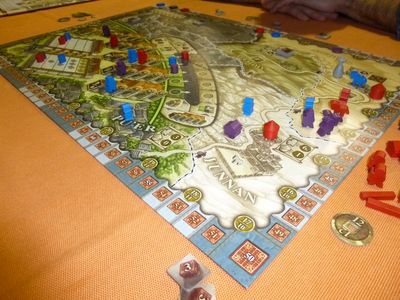 Malgré l’heure déjà tardive, je termine la soirée sur la découverte de Yunnan que Stéphan apprécie avec plusieurs parties au compteur : il nous explique donc les règles pour une partie à 3 joueurs.