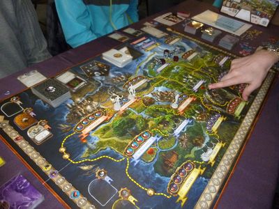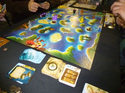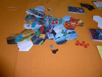 Dès qu’un nouveau territoire est exploré, le joueur pioche une tuile et la rajoute à la zone de provenance en y mettant une unité à sa couleur. En début de chaque manche, on évalue la majorité dans chaque territoire et le joueur majoritaire reçoit la carte territoire qui octroie un pouvoir permanent pour la manche en cours.