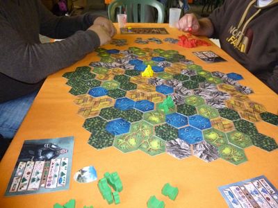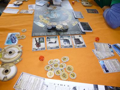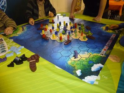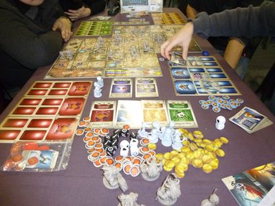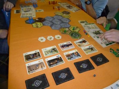 Après quelques hésitations quant au choix du jeu parmi les nombreuses boîtes, je propose à mes 3 jeunes nouveaux amis de découvrir Descendance dans la salle du haut où quelques parties sont déjà engagées : Hyperborea, Brass, Yunnan. Nous nous installons dans le coin « famille » à côté d’une partie en cours de Helvetia, un jeu au thème très proche de Descendance.