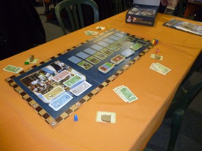 Il a été modernisé avec de nouvelles illustrations plus à mon goût et un plateau fonctionnel mais qui n’a pas grande utilité si ce n’est de prévoir les emplacements pour l’étalage des cartes et ranger les billets.