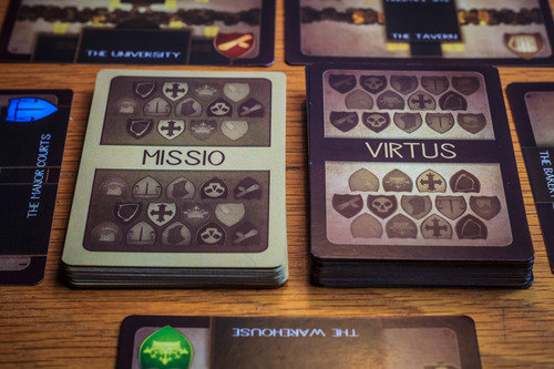 Pour la mise en place, vous commencer par poser 5 cartes de lieux urbains, en suivant l’ordre imprimé sur les cartes, chaque carte possède deux emplacements pour la même guilde, une de chaque côté. Après avoir aligner les emplacements, on mélange le paquet Virtus et on place une carte Virtus face visible sur chaque emplacement, ce qui vous donne 10 personnages à jouer au départ. Chaque joueur gagne aussi 2 cartes Virtus (personnages) et 2 cartes Missio (objectifs secrets).