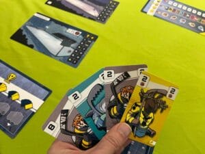 À votre tour, vous recevez deux cartes : prises dans un sens, elles indiquent votre lieu de planque dans le vaisseau, dans l’autre sens (décidément, on aime les cartes à double sens cette année) elles donnent un effet, parfois neutre pour les autres, parfois beaucoup plus mortels. Par exemple, je fais exploser la passerelle, oh sorry Michel tu t’étais caché là, quelle idée !