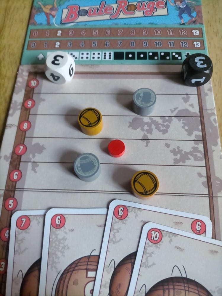 Voilà un thème peu usité dans nos intérieurs : la pétanque. Boule rouge, autrement dit cochonnet dans le jargon, est le jeton que le premier joueur va placer sur la plateau fait de lignes numérotées. Chacun a des cartes en main allant aléatoirement de 2 à 10, et à son tour on joue une carte, on place une boule de notre équipe sur le numéro de ligne jouée, puis on tire un dé pour faire avancer plus loin ou reculer la boule par un subtil effet de rétrobouling (c’est sans doute dans le jargon). Comme à la pétanque, la boule tient le point si elle est plus proche du cochonnet, mais ici pas de vraie notion de distance, les boules sont placées sur des lignes uniquement. Tant qu’on tient le point, c’est à l’autre équipe de jouer ses cartes.