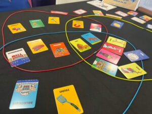 Sous l’avalanche de jeux, Chouineur a su frapper juste avec ce système de retournement de cartes. Avoir des cartes faibles et être le dernier d’un pli peut se transformer en avantage. On réfléchit alors différemment, et on prend un malin plaisir à dire “c’est moi qui chouine !” à la fin d’un pli. À cela les jolies illustrations humoristiques ajoutent un charme au jeu. Bien sûr, j’ai gagné le badge de super Chouineur sur le stand.