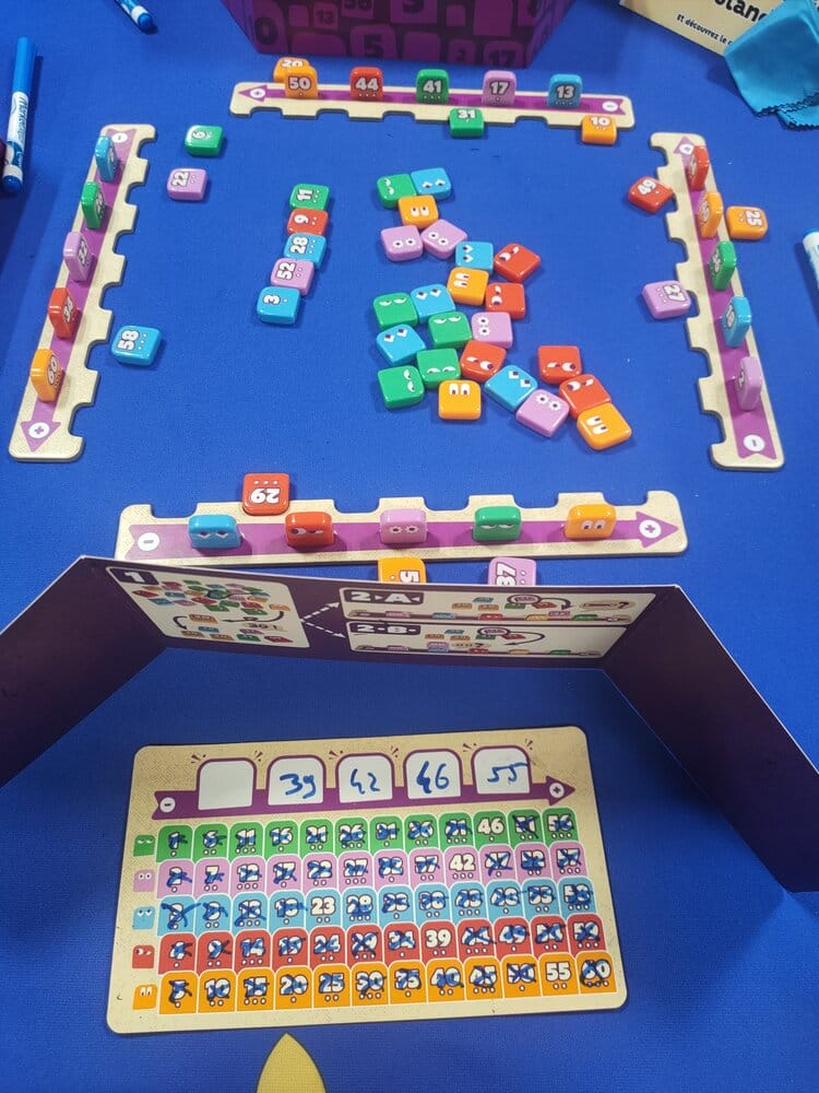 Yohan Levet, le spécialiste des jeux de déduction revient avec une nouvelle proposition, clairement familiale. Il suffit de regarder la bonne bouille des petites tuiles aux couleurs acidulées (on dirait les fantômes de Pacman). On est loin de l’aridité des cartes à trous de Turing Machine. Chaque joueur a sur son pupitre une suite de 5 tuiles de couleurs différentes, classées par ordre croissant par un adversaire. L’objectif est d’être le premier ou la première à deviner ses 5 tuiles. Derrière son paravent on a une grille qui rappelle la couleur de chaque tuile et le nombre de petits points qu’elle a (je vais y revenir). À son tour, on révèle une tuile parmi celles qui n’ont pas été distribuées, puis on en choisit une, soit pour qu’un adversaire la positionne entre deux de nos tuiles, nous permettant ainsi d’avoir un point de repère pour borner les valeurs possibles de nos tuiles, soit pour la comparer à une tuile et savoir si oui ou non elles ont le même nombre de petits points. Ce qui nous permet normalement d’éliminer pas mal de valeurs pour cette couleur.