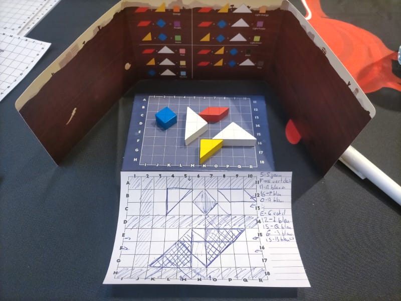 On place sur sa grille quadrillée 5 formes (deux triangles blanc, un jaune, un losange bleu et un parallélépipède rouge). L’adversaire aussi.
