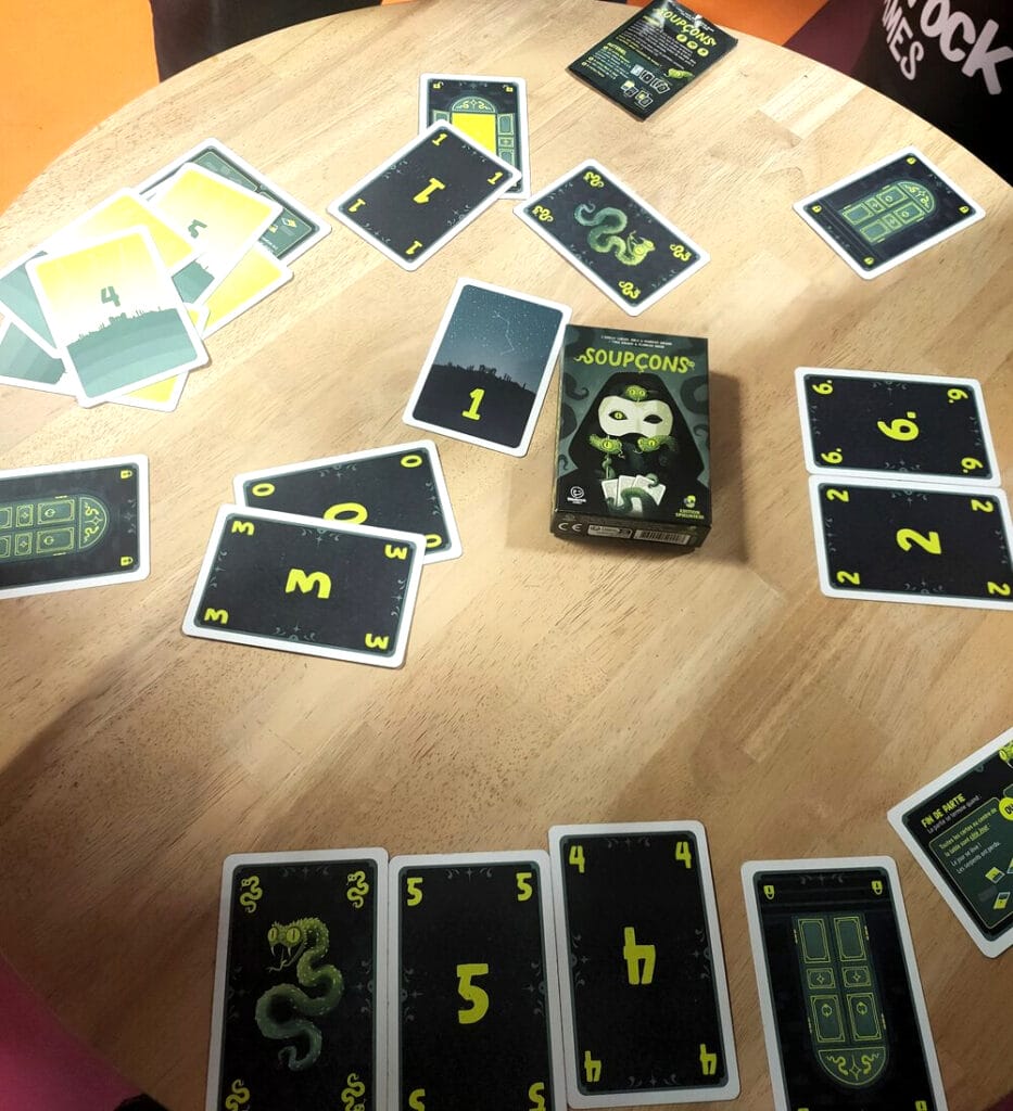 Contrairement à des jeux type Loup-garou ou Avalon, il n’y a pas de tchatche. On parle peu, mais on peut déduire des choses de ce qu’il se passe : “le 4 vient bien d’être donné à cette joueuse puisqu’on a retourné le 4 sur la table, si au tour suivant, un autre joueur me propose le 4, je saurais qu’il ment”. J’ai aussi aimé le fait de pouvoir changer de rôle en cours de partie. Un serpent qui a été démasqué peut encore embrouiller les pistes en transmettant sa carte rôle à un autre joueur, ou au contraire, on peut vouloir récupérer ce rôle si les serpents sont sur le point de gagner. Avec le passe-passe de cartes, il n’est pas évident de suivre qui a la carte maîtresse en fin de partie (le numéro à retourner ou ne pas retourner selon notre rôle). Habituellement je ne suis pas très fan de jeu à rôle caché, mais celui-ci m’a fait une très bonne impression. À confirmer sur plus de parties.
