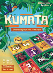 Cosmoludo est un éditeur spécialisé dans les jeux abstraits pour deux joueurs. Kumata change un peu : il est jouable jusqu’à 4, et il comporte une petite part de hasard puisqu’il y a une pioche de tuiles. Son auteur, Claude Leroy, connu pour Gygès, a publié plusieurs autres titres chez cet éditeur. Dans Kumata, vous devrez placer vos tuiles domino sur le plateau ou sur les tuiles des adversaires pour avoir la somme de points la plus élevée en fin de partie. La pose est assez classique : on doit recouvrir deux dominos, les valeurs que l’on recouvre doivent être identiques à celles de notre domino (on a aussi des cases vides sur certaines tuiles, qui sont des jokers). Et naturellement, on ne peut pas poser en biais (sur deux niveaux différents). C’est là que le jeu révèle son intérêt : sécuriser ses tuiles en créant des décalages de hauteur autour d’elles.