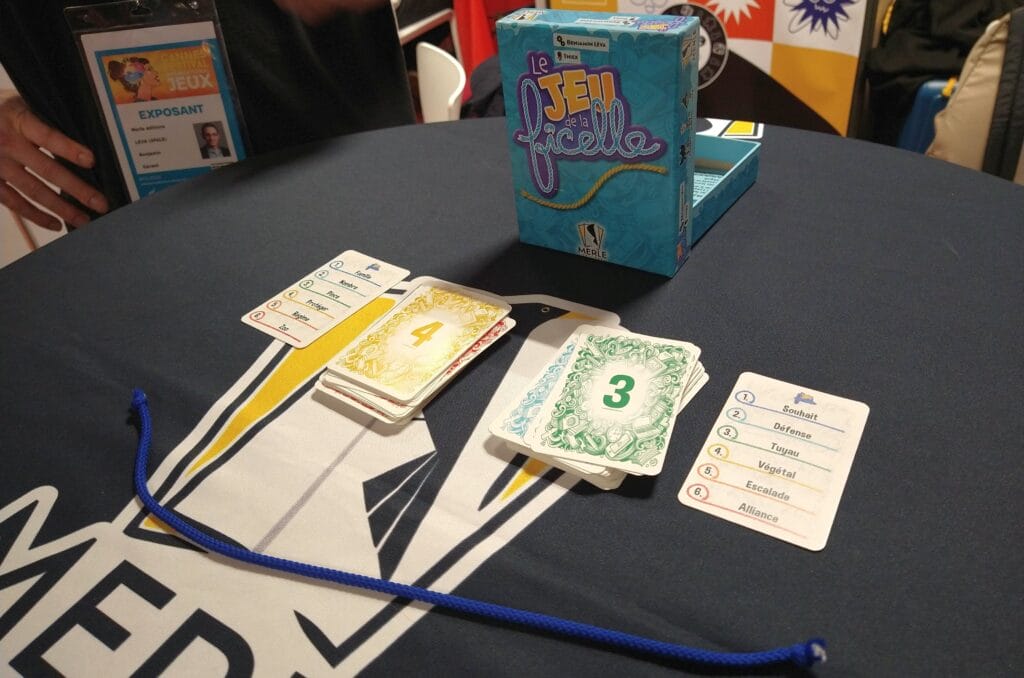 Deux pioches dont les dos de cartes indiquent un numéro, deux cartes retournées listant six mots numérotés : voilà qui définit une combinaison de deux mots, qu’il faut relier par un unique autre mot. J’ai une proposition ? j’attrape une des extrémités de la ficelle et j’attends un partenaire. Dès qu’une seconde personne se décide, on décompte à voix haute jusqu’à trois, et les deux concerné·es annoncent simultanément leur réponse. Identiques ? un point de gagné. Différentes ? c’est raté, et les deux mots en questions relancent immédiatement un tour.