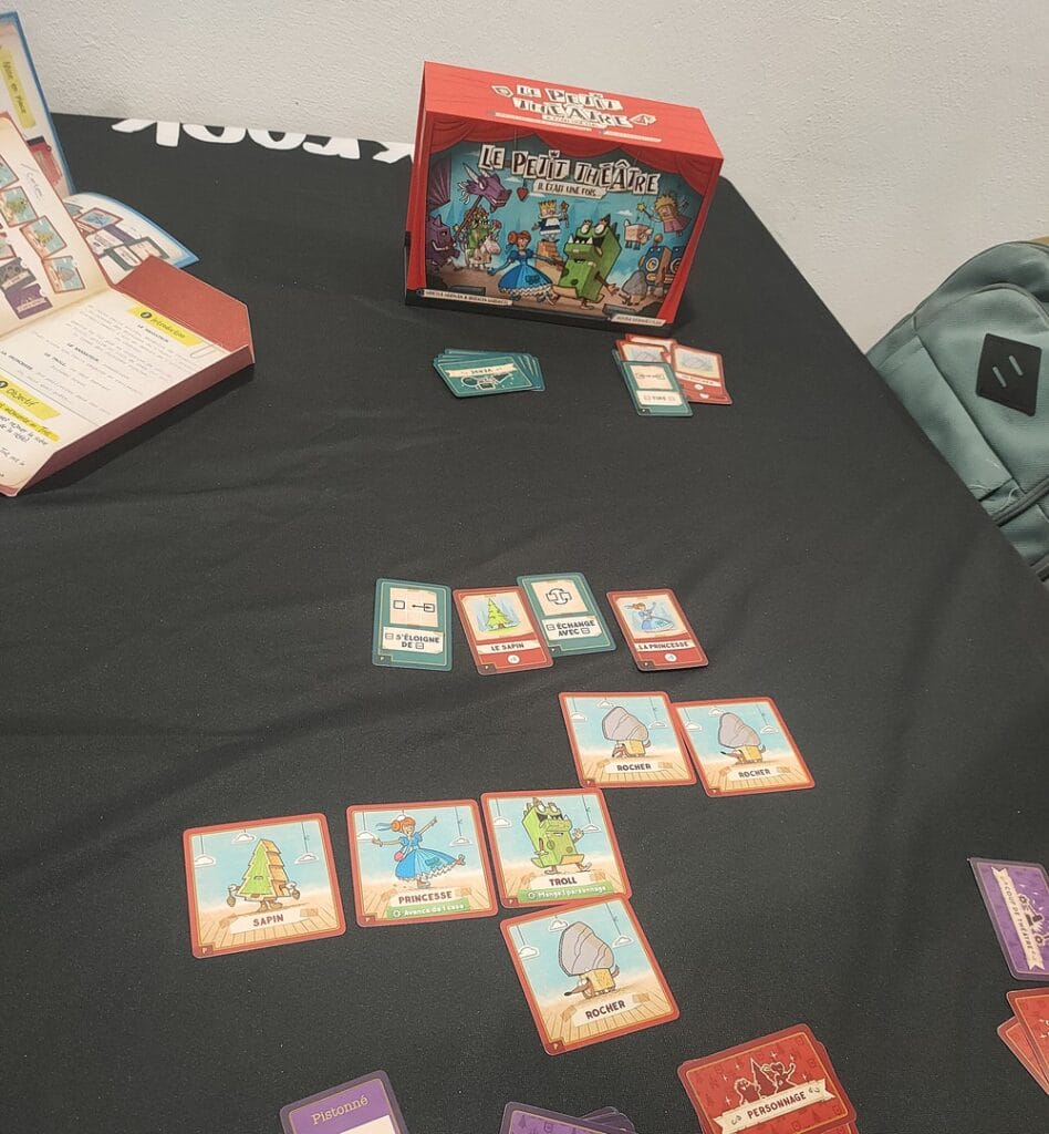 Quand on voit la boîte du petit théâtre, on s’attend à un jeu narratif. Par le thème, le pitch sur le dos de boite (“formez des phrases, déplacez des personnages, accomplissez des objectifs pour avancer dans l’histoire”) et l’un des auteurs, Quentin Guidotti, qui nous a proposé récemment Butterfly effect et un scénario de Backstories. De plus, quand on ouvre la boîte, on trouve plusieurs dossiers/intercalaires qui nous font penser à Perspectives. Sauf que non, ce petit théâtre est un puzzle game coopératif. Au cours des 12 scènes qui forment la pièce de théâtre, nous allons devoir réunir (ou séparer) certaines tuiles personnages. Dans le prologue joué au FIJ, il s’agissait de la princesse et de l’ogre. Chaque scène a une intro qui donne le contexte de ce que nous allons devoir réaliser lors de notre partie et une conclusion qui fait avancer l’histoire. On peut la lire ou bien l’écouter (un acteur incarne la scène qu’on écoutera grâce à un QR code). Mécaniquement, il n’y a pas de tour de jeu. Les joueuses échangent pour savoir quelles cartes personnages de leur main jouer de part et d’autre des cartes verbe d’action placées sur la table, pour effectuer des mouvements : “princesse éloigne rocher”, ou “ogre pivote arbre”.