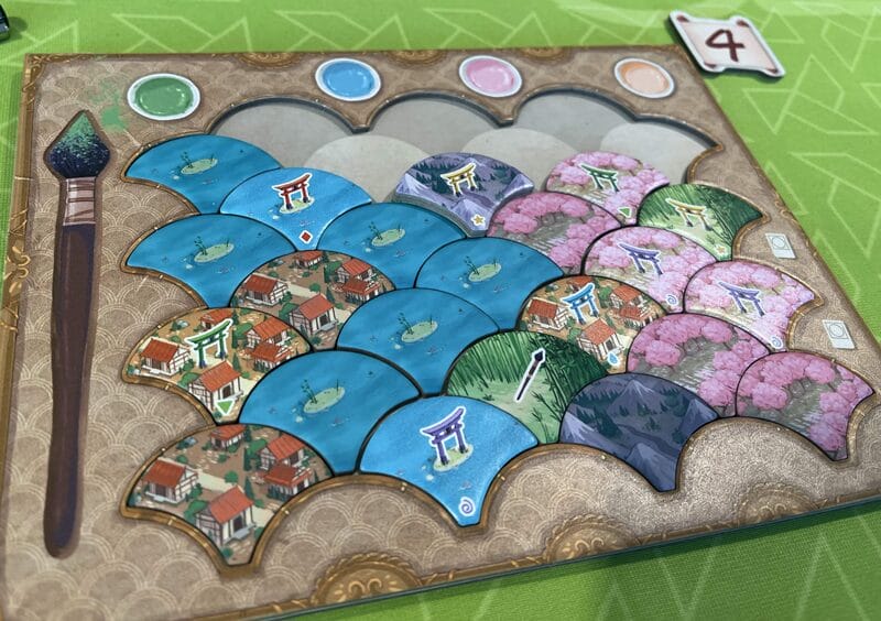 À son tour, le joueur actif va devoir choisir une des tuiles disponibles sur une des deux roues. Se faisant, il rend de nouvelles tuiles disponibles aux autres joueurs. Le placement ne peut se faire que de bas en haut, et en respectant le mur de briques. Tout le jeu repose sur ces tuiles et sur ces contraintes : ainsi, les tuiles « rivières » marquent des points si elles forment une suite ininterrompue, les tuiles « bambous » marquent qu’en groupe de deux, etc. S’ajoute aussi une collection de Tori. Quelques pouvoirs aussi à gagner, comme le pinceau qui permet de s’affranchir de la règle de prise de tuiles (mais une seule fois) et bien d’autres.