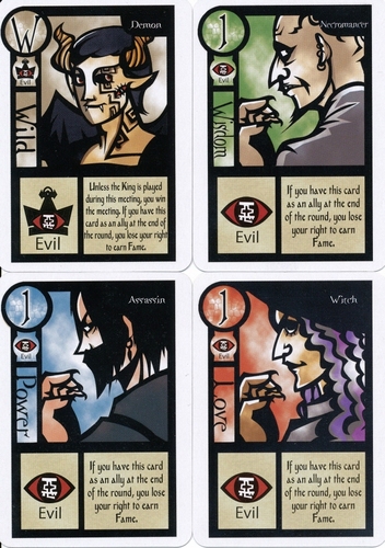 Lorsque tous les joueurs ont joué une carte, le joueur ayant joué la carte la plus forte est le vainqueur du pli. Il ramasse les cartes jouées et les place vers lui, elles sont nommées ses « Alliés » et il devient 1er joueur pour le tour suivant. On continue jusqu’à ce qu’un joueur se retrouve à court de cartes. Là, les joueurs ayant un ou plusieurs alliés avec le symbole « Mal » sont exclus du tour. Parce que c’est mal. Et parmi les joueurs restants, ceux qui ont réussi à faire honneur aux objectifs de la carte Récit en court gagnent 1 point de Gloire. Comme chacun sait, dans les grands coeurs, l’amour de la gloire occupe la place que la vanité remplit dans les âmes vulgaires. Et oui ma bonne dame. C’est pourquoi la partie se termine aussitôt qu’un joueur détient 3 points de Gloire. Point trop n’en faut.