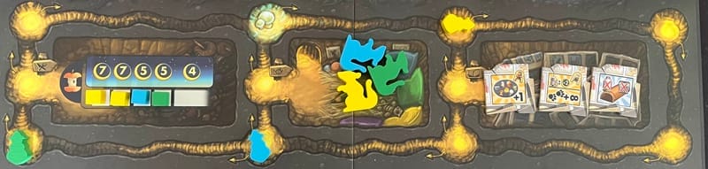 Si je vous dis jeu de parcours, ça peut vous évoquer des jeux comme le jeu de l’oie, ou Cartagena. On a un jeu plus malin qu’il n’y parait et qui offre de jolis dilemmes. Déjà, il faut anticiper ses actions. Mais les ressources que l’on va collecter ont toutes leurs utilités, commençons par le fromage, pour préparer une expédition comme celle-ci, il faudra en collecter, et, en dépensant 10 fromages, on va placer notre cube sur la piste correspondante et gagner des points de victoire. Mais il faudra aussi donner un fromage à un joueur si l’on arrive sur une case occupée par un rongeur adverse. Et on ne pourra pas y déroger, car ça coute des points en moins. Mine de rien, cela crée une interaction substantielle.