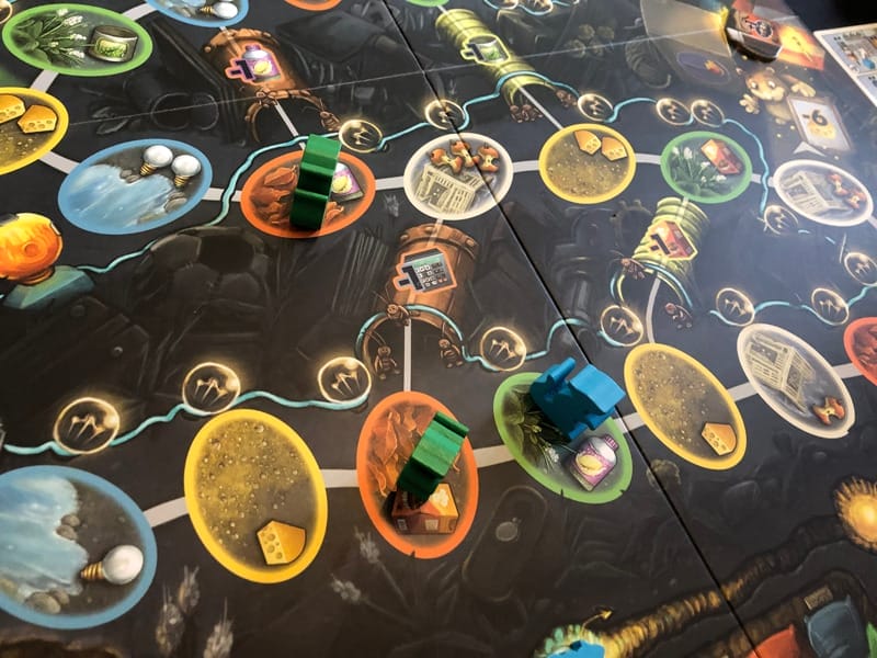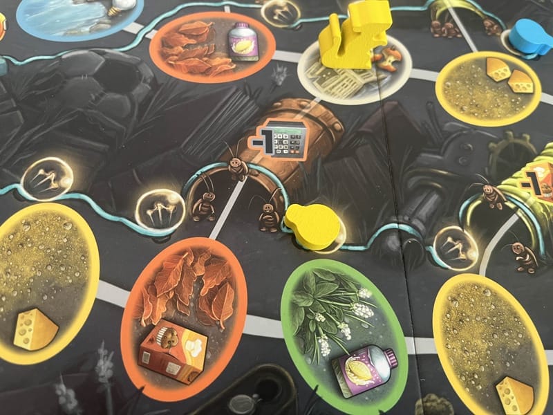 Avec l’ampoule, on construit sa ligne électrique et une case éclairée rapporte une ressource de plus. De plus, atteindre certains seuils donne des points de victoire, vous avez compris le principe. Comme on va repasser plusieurs fois dans la décharge, l’éclairer nous permet de parier sur le long terme et de gagner plus de ressources. Les trognons de pommes nous permettent de déplacer un marqueur dans le terrier.