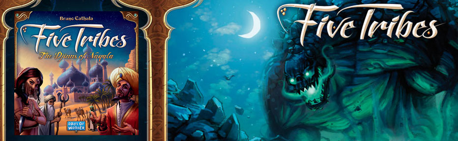 « Five Tribes, Les Djinns de Cathala Naqala » est un jeu de déplacement d’ouvriers dans l’univers des Mille et Une Nuits, de 2 à 4 joueurs (et non 5 comme le titre pourrait le supposer) à partir de 13 ans, d’une durée annoncée d’environ 60 minutes, édité par Days of Wonder et illustré par Clément Masson.