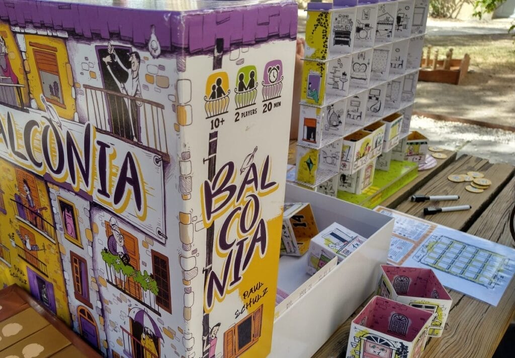 Balconia (2025) : Avec sa présence de table assez singulière, sa DA particulière et sa vraie exploitation de l’aspect 3D dans la mécanique, Balconia intrigue. Simple et rapide, il s’avère toutefois assez difficile de maîtriser grand chose. L’aspect mémoire semble utopique, et les tentatives de construire un scoring cohérent se voient involontairement saccagées par l’adversaire, dont les choix de placement du balcon proposé sont impossibles à anticiper. | Bravest (2025) : Ce puzzle game compétitif est plutôt réussi en terme de dilemmes de placement personnel. La quasi absence de contrainte de pose permet d’avoir toujours quelque chose à faire, d’autant qu’on travaille en parallèle sur deux « chemins » qui se rejoindront, ou pas. Les façons de scorer, quoique ultra-classiques, sont solidement implémentées et agrémentées de tuiles spéciales de bon aloi. Plutôt agréable, avec toutefois une interaction réduite à la portion congrue. | |