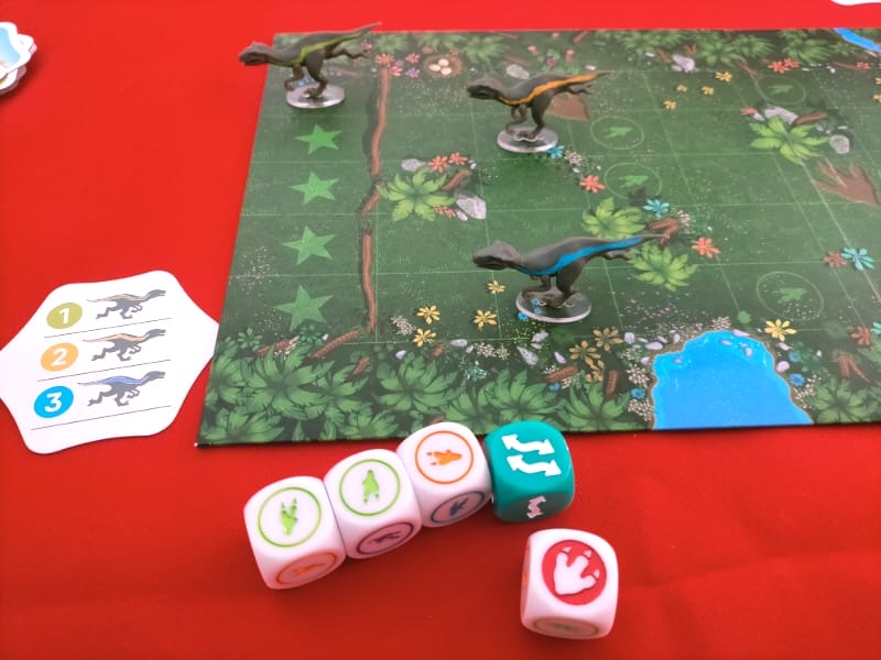 Raptor Race (2025) : Voici un croisement entre La course des tortues et Ready set bet : vous devez faire arriver votre trio de tête pour remporter des points, mais les autres ne savent pas quel est votre trio. On fait avancer les raptors en laissant et relançant des dés, qui affichent quel dino va bouger, les mouvements latéraux qu’ils pourront faire, ou même les faire reculer. Les dés se maîtrisent assez facilement dans le sens où on pourra activer un dino pour le faire passer sur un bonus qui permettra de faire avancer qui on veut. C’est un jeu pour les 6+, avec un peu de bluff, un peu de calcul de déplacement malin, et pas mal de chance sur les objectifs qu’on partage ou pas, ce qui donnera des dinos fainéants et d’autres survoltés. | Sucré ou salé ? (2025) : L’extralucide doit faire deviner au reste de l’équipe un mot de la grille de 4×4. Vous choisissez alors d’orienter la carte pour guider les autres. Ils devront alors enlever une ou plusieurs cartes (Similo), avant de passer à la double proposition suivante, petit / grand, sec /humide. Bien sûr, ces adjectifs ne vont pas bien permettre de définir votre mot, et c’est là qu’est le jeu, l’interprétation et les rires. Chacun son vécu, sa vision des choses. Il faudra qu’il ne reste que votre mot en 4 ou 5 propositions. Pas si facile, pas si original, mais assez fun. | |