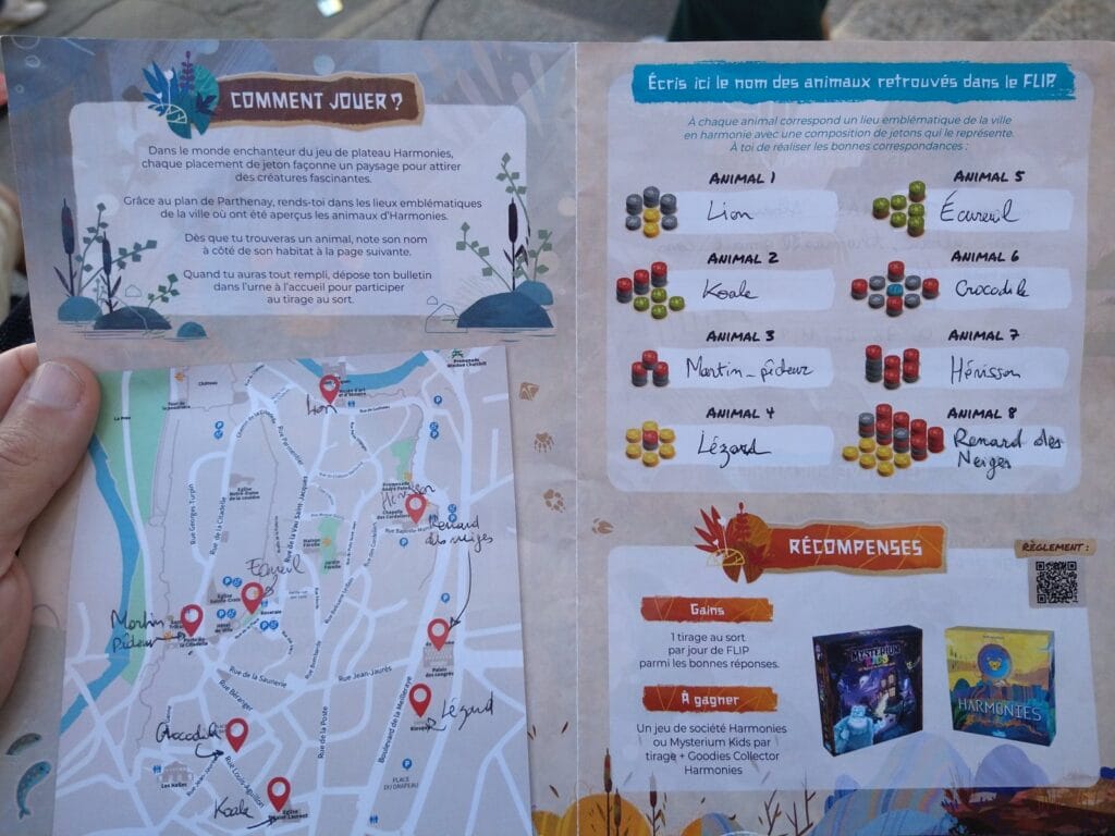- Un jeu de piste Harmonies des plus personnalisés, consistant à faire la correspondance entre compositions issues de pions du jeu d’une part, et lieux emblématiques de Parthenay d’autre part.
