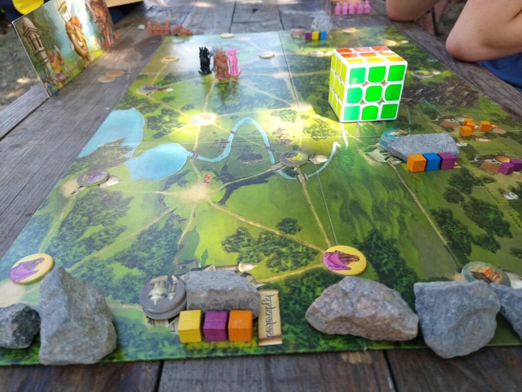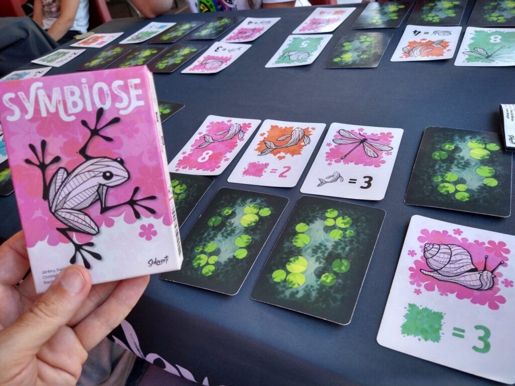 Miroir Magique (2025) : Un jeu à partir de 5 ans qui aurait pu s’adresser à un public plus large. Chacun a une grande carte composée de plusieurs demi objets entremêlés, et au centre 12 petites cartes vont représenter certains des objets de nos cartes. Il faudra les trouver et le prouver en utilisant une carte miroir qui recompose ainsi l’autre partie de l’image. La DA est au top, pourtant ce jeu manque pour moi de profondeur au niveau des règles. Dommage, il aurait pu être très poétique. | Mycelia (2023) : Déjà sorti depuis deux ans, j’ai pu enfin l’essayer sous la tente découverte. Rien à redire de ce jeu de deckbuilding, où l’objectif est d’être le premier à retirer les gouttes de condensation de son plateau. Pour cela vous devrez user des effets de vos cartes, qui agiront sur des cases avec 1, 2 ou 3 gouttes, sur de l’herbe ou des feuilles, etc. A vous d’acheter les bonnes cartes pour que votre moteur soit efficace. Mycelia est accessible et parfait pour faire découvrir les rouages du deckbuilding. Il sera de fait plus dispensable pour des joueurs aguerris au genre. | |