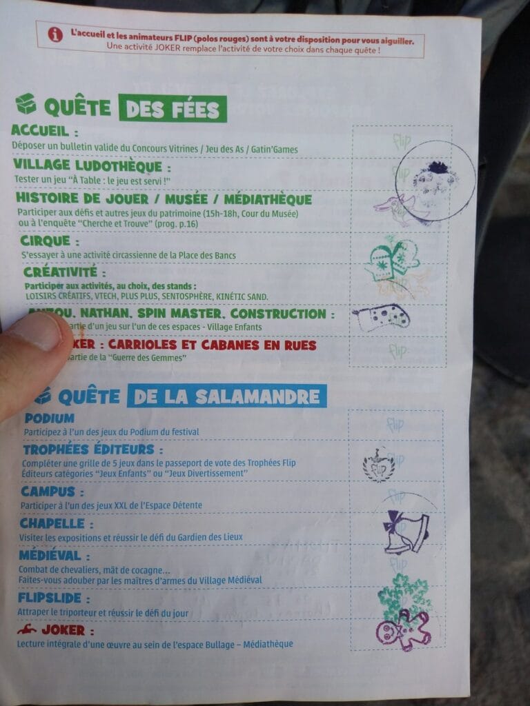 - La présence du projet associatif Jeux en route, dont le FLIP constituait l’une des étapes de son tour de France en van. Son objectif est d’encourager l’interaction et renforcer la solidarité dans des territoires éloignés des activités culturelles collectives.