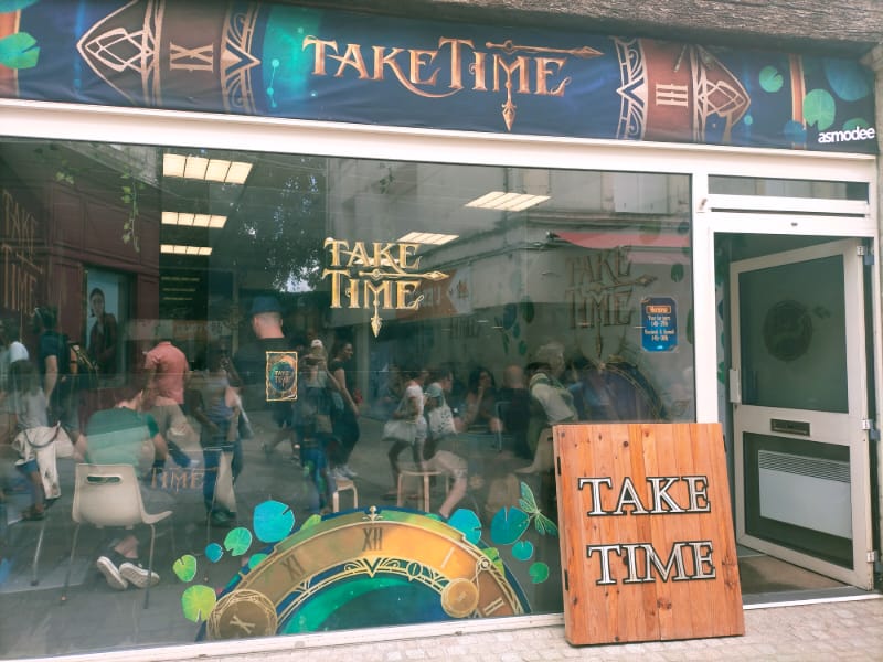 Syncro (2023) : Passé sous mes radars, il a pourtant quelque chose à proposer en coop léger qui s’emmène partout, avec son feeling un peu à la Regicide. On prend plaisir à découvrir progressivement les pouvoirs des monstres nous barrent la route, au fil des « scenarios » successifs. On râle sur les partenaires qui assurent trop (gâchant ainsi de précieuses cartes), qui assurent pas assez (mettant bêtement notre réussite en péril), et on se gargarise des belles actions. Assez facile et d’une profondeur limitée, il est a priori surtout destiné à un public ado/peu exigeant. | Take Time (à paraitre) : Voici LA découverte, la claque du FLIP, disposée par l’éditeur dans une salle à l’ambiance tamisée. Jeu de cartes coopératif, les sensations se rapprochent un peu de The Mind car l’objectif est de déposer nos cartes à tour de rôle dans un ordre croissant. Une pointe de The Crew se fait également sentir, car chaque scenario a ses contraintes et ce sera à chaque joueur de comprendre quel est son rôle en fonction de sa main de cartes. Cependant, Take Time propose un gameplay nouveau, une expérience unique, où l’on échange beaucoup avant de se lancer et de jouer dans le silence. Merveilleux, tendu, 40 niveaux. | |