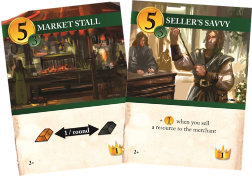 Dans le tour de jeu, on va d’abord constituer l’offre du marché en révélant la carte du dessus des 5 paquets correspondants, et faire de même avec l’offre des quêtes.