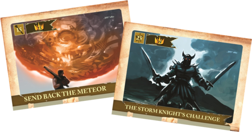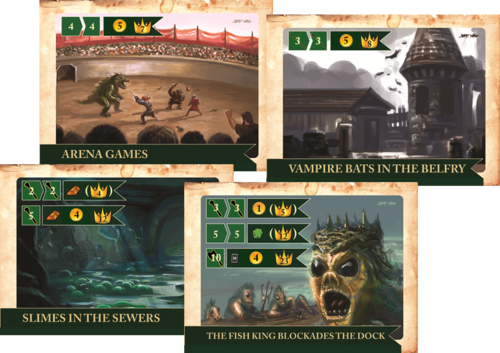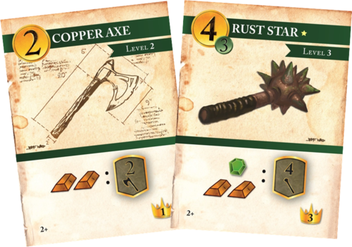 Dans les actions existantes, vous pouvez aller voir le forgeron pour acheter un plan d’arme, aller au bazar pour acheter des cartes bonus, à la caserne pour engager un nouvel aventurier tout frais ou level-uper un aventurier moins frais, allez sur la route pour faire avancer une quête, etc. Selon sur quoi vous misez, vous gagnerez des points si vous parvenez à faire honneur à vos engagements. Par exemple, le bonus du forgeron donne 2 points pour chaque plan d’arme possédé par le joueur etc…