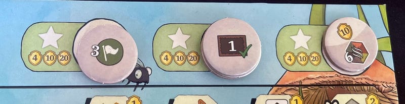 Et j’en viens à parler de ces étoiles, trois conditions qui vont me rapporter entre 4 et 20 points. Par exemple, dès la troisième phéromone placée je pose un jeton étoile, j’en placerai un autre dès la 5e et le dernier dès la 6e. Cela accélère aussi la fin du jeu. Je peux aussi me concentrer sur les drapeaux présents sur les tuiles Incubation ou sur des cartes. Dernier axe avec la construction de la fourmilière.