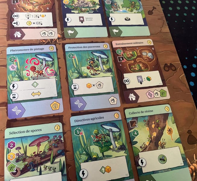 Fourmis est un jeu à moteur, que nous développons avec nos cartes et la gestion de notre fourmilière. Parlons des cartes justement car c’est un élément très important. Elles nous donnent des bonus de production, des actions gratuites, etc. Une petite sensation de combo mais sans trop, pas de tour à rallonge (oui je pense à toi Recall ^^).