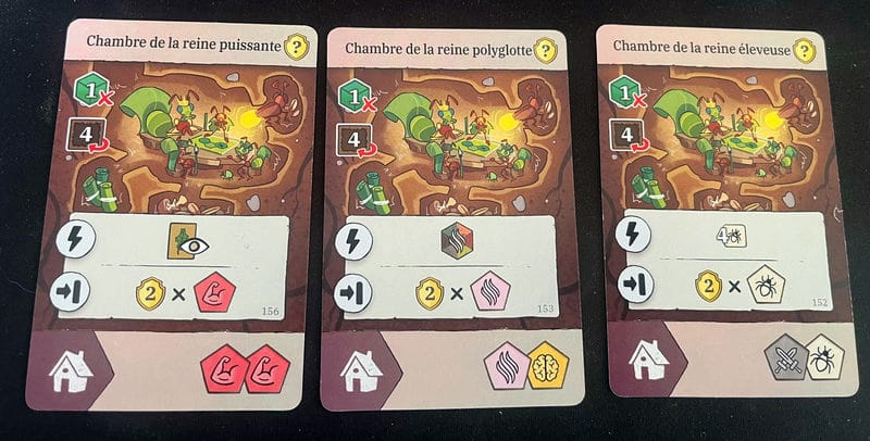 Les cartes chambre de la reine sont surtout des pourvoyeurs de points de victoire, mais demandent beaucoup de préparation. On peut garder les deux ou aucune, rien n’est interdit, c’est une affaire de choix. Dans une de nos sessions, le gagnant n’en a joué aucune, ce qui prouve que c’est faisable.