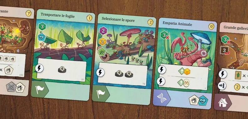 Fourmis nous demande de gérer et développer une colonie de fourmis qui vont explorer le jardin, collecter des ressources, creuser la terre, et construire les chambres de la colonie. On va aussi jouer des cartes nous permettant de développer un moteur de jeu.