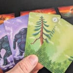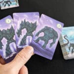 Le jeu consiste à affronter trois ennemis, des châteaux ambulants, en un maximum de 4 manches. Pour cela, vous aurez uniquement un paquet de cartes à votre disposition. Chaque tour vous aurez trois cartes en main, en piocherez une, puis n’aurez qu’un choix à faire : soit défausser une carte pour en obtenir de nouveau trois en main, soit « scorer » votre main. Scorer consiste à défausser vos trois cartes de la même famille (golems, dragons ou Ents). Vous ne pourrez donc le faire qu’à cette condition (en réalité il existe une exception, mais je ne rentrerai pas dans ce détail !). Des possibles combinaisons de cartes qui vous donneront accès à plus de points. Par exemple, si vos dragons ont tous deux têtes, vous marquerez 3 points au lieu de 1. S’ils sont tous de la même couleur, vous doublez ces points, etc. Chaque famille ayant ses spécificités. Une première lecture des règle, nous imposera de mémoriser ces combinaisons, mais c’est globalement le seul effort qu’il y aura à faire.