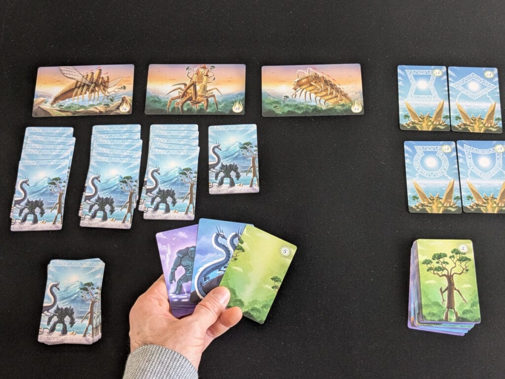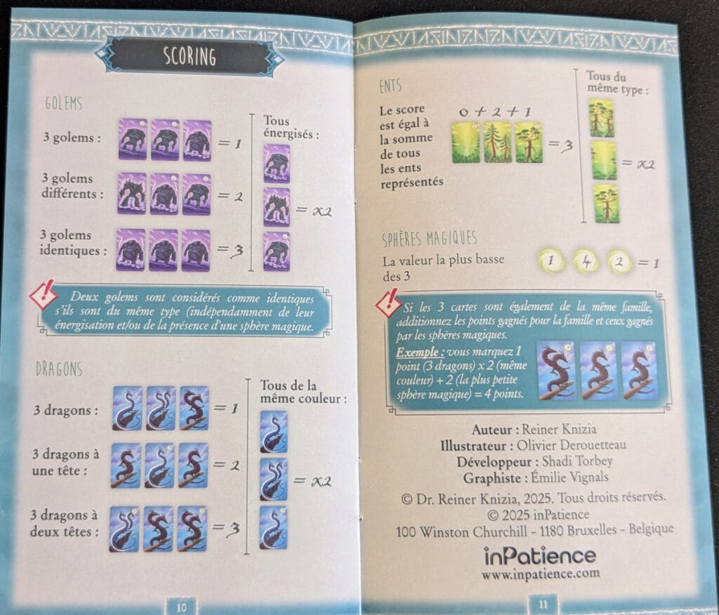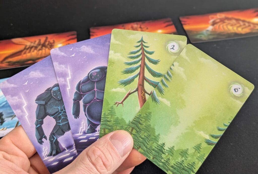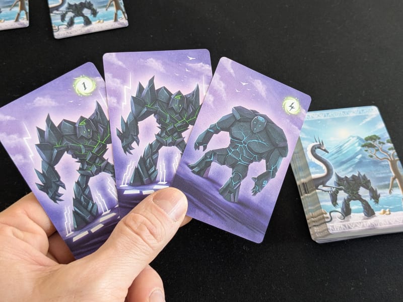 Le jeu consiste à affronter trois ennemis, des châteaux ambulants, en un maximum de 4 manches. Pour cela, vous aurez uniquement un paquet de cartes à votre disposition. Chaque tour vous aurez trois cartes en main, en piocherez une, puis n’aurez qu’un choix à faire : soit défausser une carte pour en obtenir de nouveau trois en main, soit « scorer » votre main. Scorer consiste à défausser vos trois cartes de la même famille (golems, dragons ou Ents). Vous ne pourrez donc le faire qu’à cette condition (en réalité il existe une exception, mais je ne rentrerai pas dans ce détail !). Des possibles combinaisons de cartes qui vous donneront accès à plus de points. Par exemple, si vos dragons ont tous deux têtes, vous marquerez 3 points au lieu de 1. S’ils sont tous de la même couleur, vous doublez ces points, etc. Chaque famille ayant ses spécificités. Une première lecture des règle, nous imposera de mémoriser ces combinaisons, mais c’est globalement le seul effort qu’il y aura à faire.