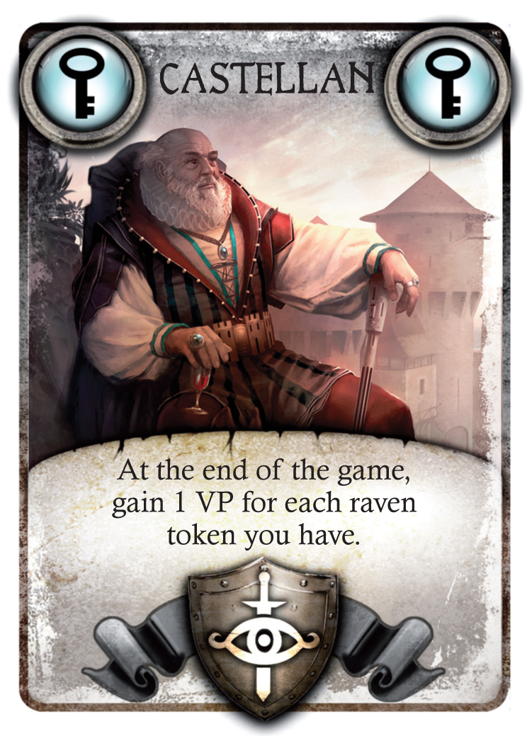 – Vous jouez une carte et appliquez ses effets. Cela peut être par exemple une carte Coinage : si vous la jouez, vous piquez une carte au hasard dans une main adverse. Le pauvre bougre qui se sera ainsi fait injustement volé prendra votre carte Coinage en échange, et hop, à charge de revanche. Cela pourrait aussi être une carte Knight : là vous attaquez carrément quelqu’un et tout le monde décidera secrètement de son camp avec son jeton de vote. Les jetons corbeaux pourront aussi être utilisés pour faire pencher la balance (chaque corbeau dépensé est considéré comme un vote en plus). Le joueur qui aura reçu le plus de votes sera le gagnant du combat. Alliances, promesses et trahisons, vous les voyez venir ? Le gagnant pourra prendre une carte dans la main du vaincu, ou piocher une carte Invités. Les Invités vous permettront de marquer des points en fin de partie, selon certaines conditions qu’il faudra veiller à respecter au mieux. Voici quelques exemples, en anglais :
