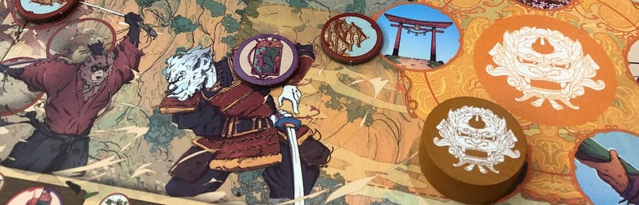 Une action de roue permet de jouer nos deux cartes, une autre de révéler une carte d’un tas que l’on a composé conjointement en début de partie (on peut donc plus ou moins deviner ce qui va sortir, selon son état d’épuisement), la case Torii à elle seule permet d’avoir le choix entre 6 actions différentes… On comprend que le tout n’est pas ultra accessible de prime abord, mais une fois que l’on s’est saisi de toute l’icono, les choses se fluidifient (une aide de jeu n’aurait pas été de trop).