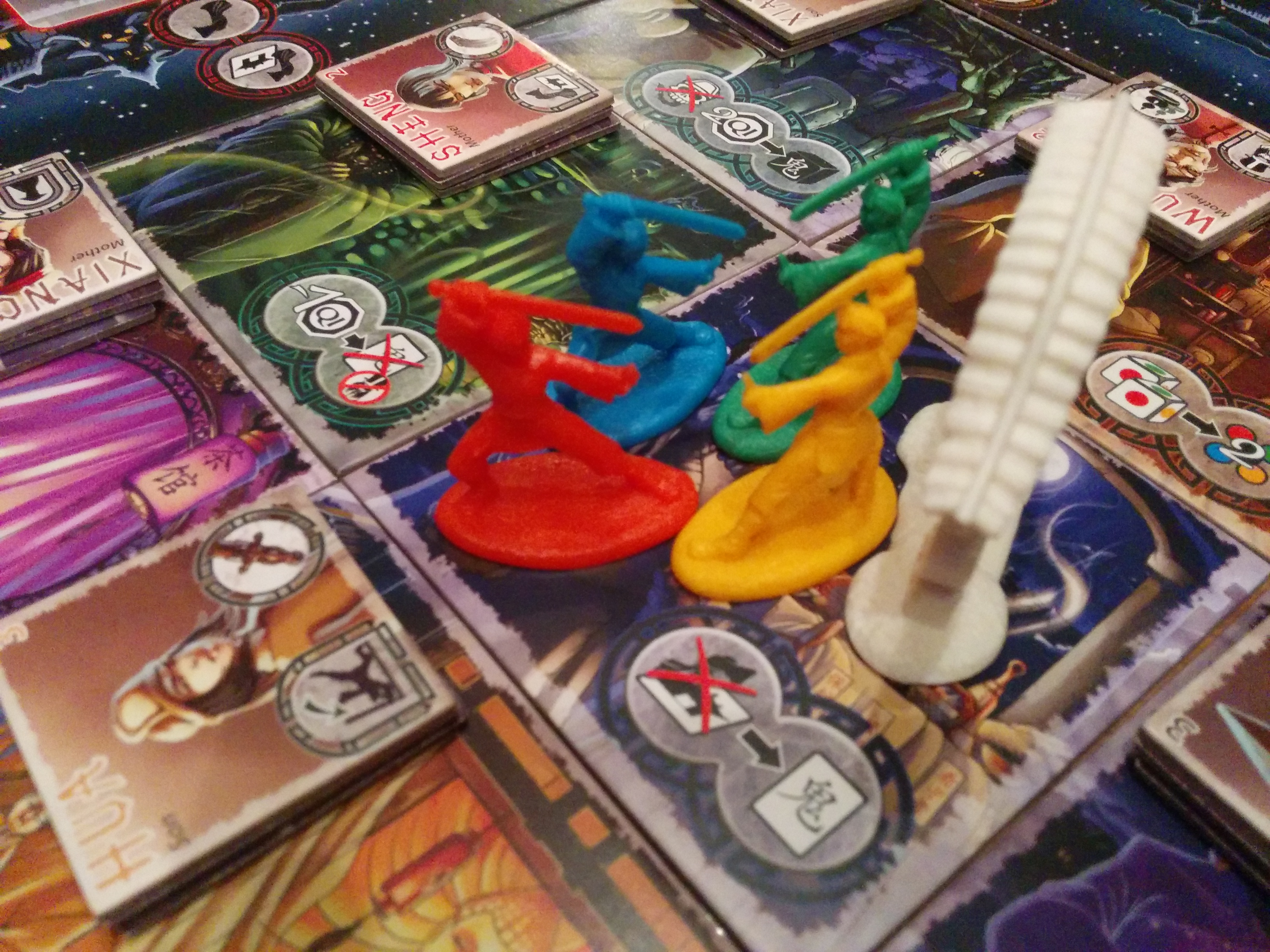 Chaque joueur choisi un moine, caractérisé par sa couleur (les mêmes que les précédentes) et une capacité dont il va pouvoir (même devoir !) se servir à chacun de ses tours pour augmenter ses chances de survie. Ce moine aura un certain nombre de jeton « Qi », qui représentent sa force vitale (plus de Qi, plus de vie !).