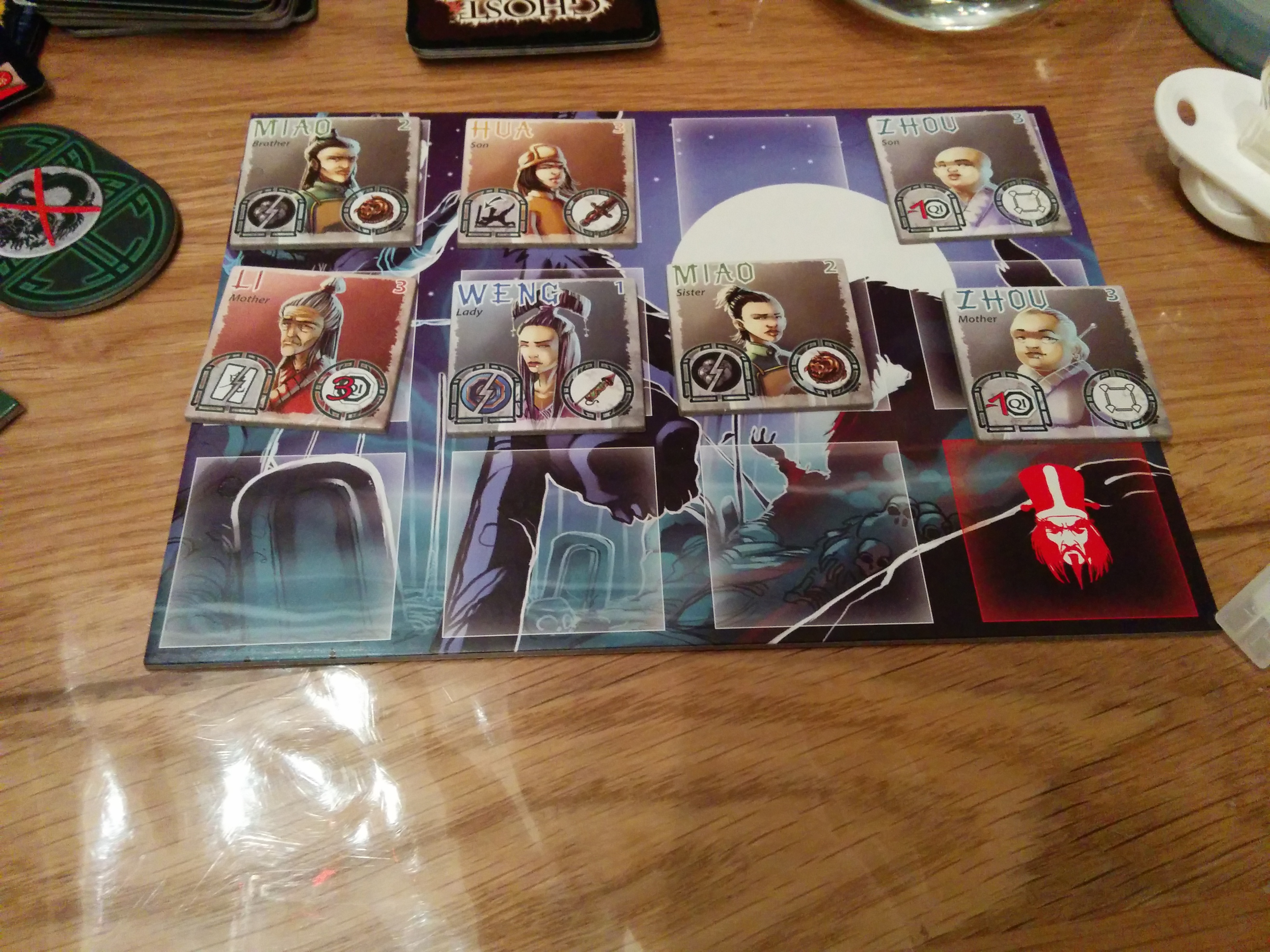 La priorité : sauver des villageois pour éviter les désagréments liés à leur mort, et pour récupérer des artefacts qui nous ont été fort utiles (spéciale dédicace au parchemin qui permet de rapatrier toute l’équipe sur une seule case, prends ça dans ta gueule Wu Feng !). Sur ce point, et comme à leur fâcheuse habitude, les fantômes n’ont pas été très coopératifs, avec des tuiles hantées très rapidement, et qui font mal au compteur de décès, un débarquement de Wu Feng pas prévu, et quelques autres joyeuseutés inhérentes au jeu.
