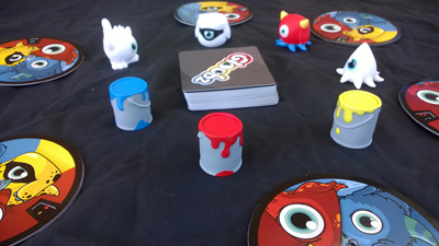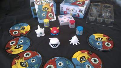 Niveau gameplay, cela fait penser à Bazar bizarre avec des figurines façon Fun farm. Vous allez commencer par retourner une carte face visible : elle montrera un ou plusieurs gloobz. Les règles nous expliquent tout ça très clairement avec force exemples. Chaque Gloobz associe une forme et une couleur. Les formes sont symbolisées par les trois figurines Gloobz et les couleurs par les trois Pots de peinture. Vous avez aussi le multigloobz qui est une sorte de version mutante du gloobz !