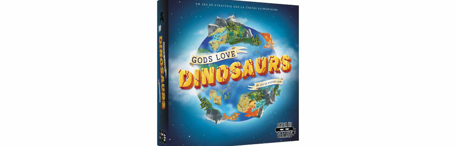 Gods Love Dinosaurs arrive en français chez Catch Up Games le 10 décembre. Pour situer un peu, c’est une création de Kasper Lapp, l’auteur de l’excellent Magic Maze. Le jeu est initialement édité en anglais par Pandasaurus Games, maison qui propose des jeux avec des thèmes qui sortent du lot et des mécaniques originales. On pourrait citer Sonora un Flick And Write dans le désert, Godspeed où les nations partent à la course à l’espace, ou encore Umbra Via, un jeu un peu abstrait où l’on place des tuiles à l’aide d’enchère avec des fleurs pour réaliser des chemins sur un plateau (j’ai dit que c’était original ^^).