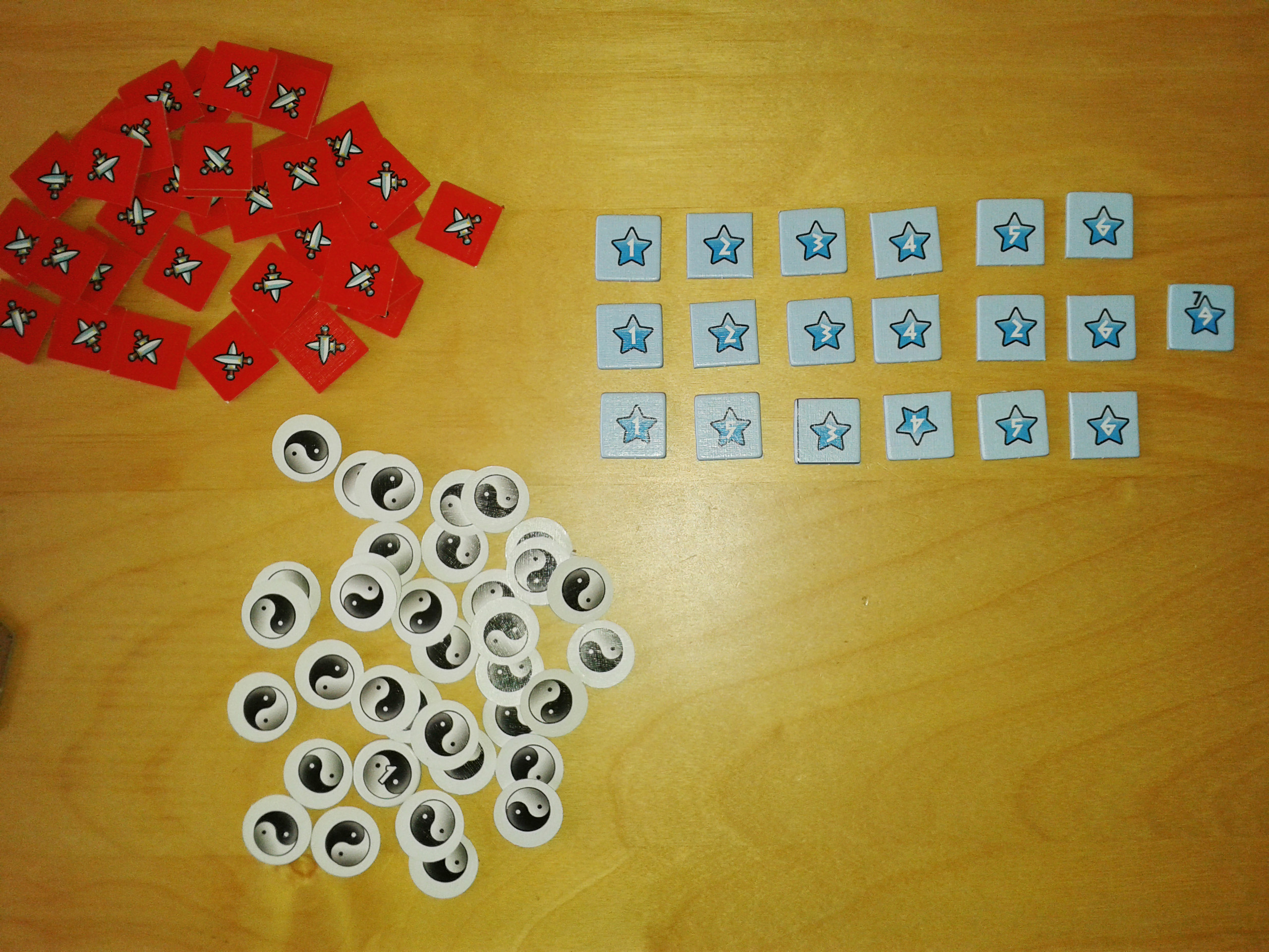 Trier les jetons de victoire en début de partie est une tâche méticuleuse. D’ailleurs, 3 erreurs se sont glissées dans cette photo…