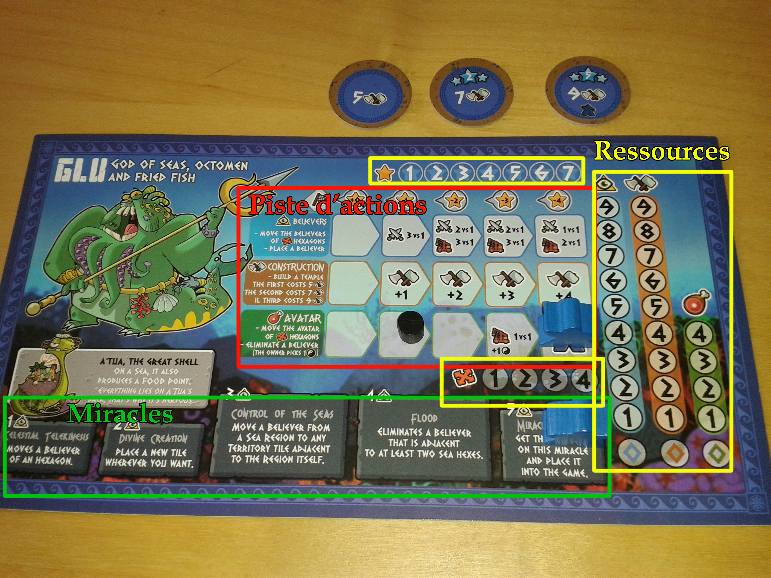 Mais si vous croyiez que le job de dieu, c’était un peu comme faire de la magie (vous dites deux trois mots sacrés et hop ! un truc classieux sort du néant), vous risquez d’être déçu. Il y a 5 ressources à gérer : la Foi, la Construction, la Nourriture, la Vitesse et la Gloire. Ces ressources vont vous permettre d’accomplir des actions à chacun de vos tours, et il est impossible de les conserver d’un tour sur l’autre : vous ne jouez qu’avec ce que vous venez de collecter.